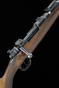 22-inch barrel with ramp fore sight and graduated tangent rear sight, the Mauser stamped receiver dated 1912 and fitted with bases for claw mounts, bolt with flag safety, double set triggers, half length stock with pistol grip and cheekpiece, 7lb., nitro proof