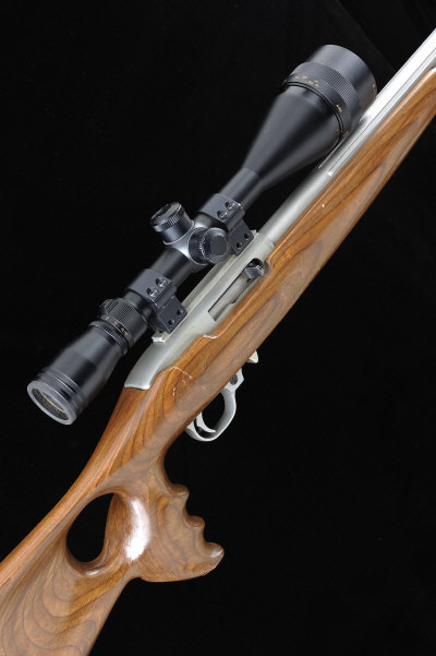 RUGER A .22 MODEL 10/22 SELF-LOADING RIFLE, NO. 247-73735 20-inch fluted Hogue barrel, the receiver mounted with an Edgar Brothers telescopic sight, laminated thumbhole stock with 14 1/2-inch pull, 8lb. 14oz., nitro proof |