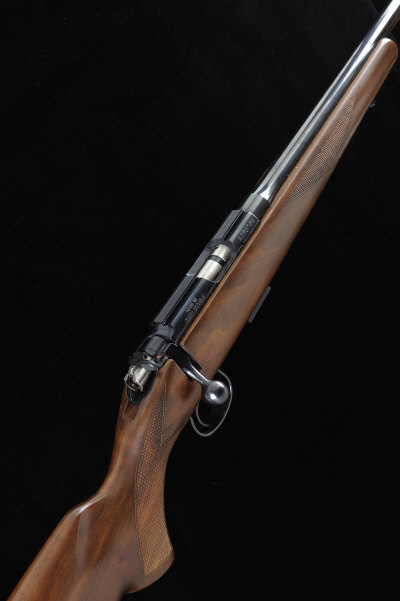 20 1/2-inch barrel threaded for a sound moderator, the receiver with detachable box magazine, the half length stock with pistol grip and recoil pad, 13 3/4-inch pull, 5lb. 14oz., nitro proof