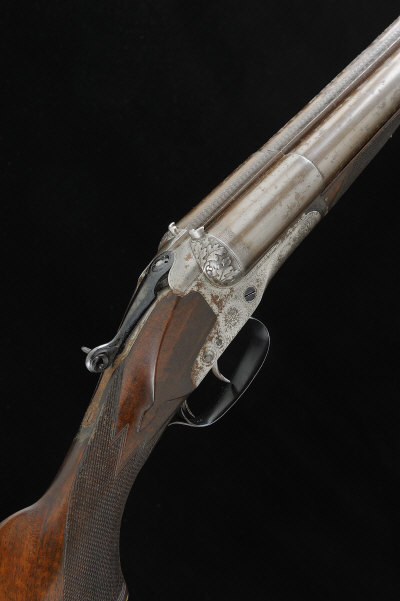 A GERMAN 12-BORE BOXLOCK NON-EJECTOR GUN, NO. 185595 28-inch monobloc barrels with 2 1/2-inch chambers, about true cylinder and 1/4 choke borings, the frame and top lever with bouquet and scroll engraving, crossbolt extension, fences carved with oak leaves, push-forward cocking lever and fired indicators, 14 1/2-inch figured stock with pistol grip, cheekpiece and 1-inch extension, 6lb. 5oz., nitro re-proof, externally lightly rusted overall S2 |