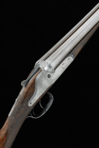 30-inch damascus barrels with 2 1/2-inch chambers about 1/4 and 1/2 choke boring, the frames, backlocks and numbered top levers with fine scroll engraving, 14 3/4-inch figured stocks with chequered butt plate, 7lb., nitro proof, in their leather case