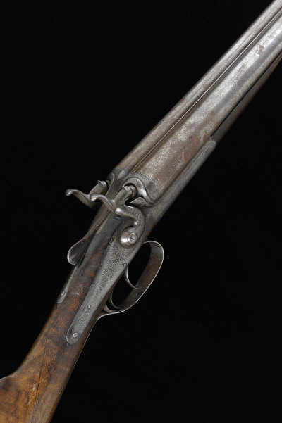 JOSEPH LANG & SON A 12-BORE TOP LEVER HAMMER GUN, NO. 5266 30-inch damascus barrels with 2 1/2-inch chambers, about true cylinder and improved cylinder borings, the rounded frame, rebounding back locks, hammers and top lever with fine scroll engraving, 14 1/2-inch well figured stock with steel butt plate, 6lb. 14oz., black powder proof (1868 Rules), bores pitted, worn overall, re-jointing recommended S2 |