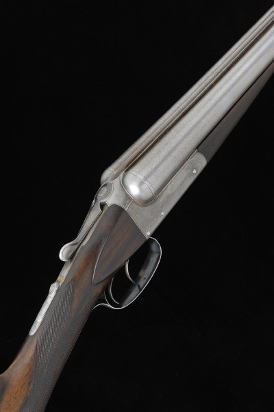 WILLIAM POWELL A 12-BORE BOXLOCK EJECTOR GUN, NO. 9680 29 3/4-inch damascus barrels with 2 3/4-inch chambers, about 1/4 and 1/2 choke borings, doll's head extension, the frame and top lever with border engraving and retaining traces of original hardening colour, 14 1/2-inch figured stock including 3/8-inch ebonite heel plate, 6lb. 12oz., nitro re-proof S2 |