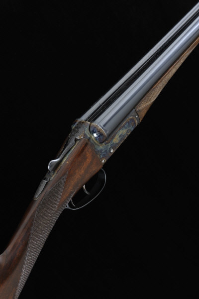 26-inch barrels with 2 3/4-inch chambers, about 1/4 and 1/2 choke borings, the frame and top lever with scroll engraving and retaining virtually all of its original hardening colour, 14 3/4-inch figured stock, 6lb.. 5oz., nitro proof, left ejector defective
