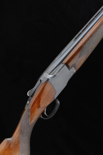 BROWNING A 12-BORE SINGLE TRIGGER OVER AND UNDER EJECTOR GUN, NO. 94270 30-inch barrels with 2 3/4-inch chambers, about improved cylinder and 1/4 choke borings, narrow machined ventilated rib, the plain blacked frame with border engraving, selective single trigger, 14 1/2-inch figured stock with pistol grip and slightly raised comb, 7lb. 6oz., Belgian nitro proof |