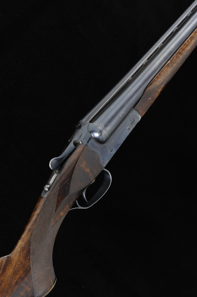 26-inch barrels with 2 3/4-inch chambers, about 1/4 and 1/2 choke borings, machined ventilated rib, the blacked frame and top lever with border engraving, selective single trigger, 14 3/4-inch figured stock with pistol grip and recoil pad, beaver tail fore-end, 7lb. 2oz., Spanish nitro proof, top horn cracked and repaired