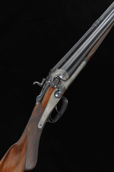 A. HOLLIS & SONS A 12-BORE SHOT AND BALL HAMMER GUN, NO. 30123 28-inch barrels with 2 1/2-inch chambers, about true cylinder borings, the machined rib with folding Express sights and doll's head extension, the rounded frame, rebounding back locks, hammers and top lever with scroll engraving, 14 1/2-inch figured stock with pistol grip and heel and toe plates, 7lb. 2oz., nitro re-proof |