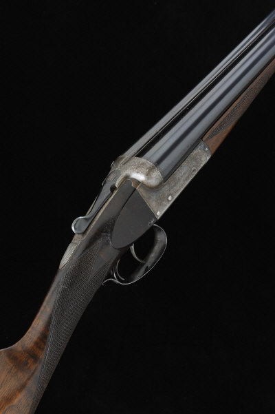 WEBLEY & SCOTT A 12-BORE BOXLOCK EJECTOR GUN, NO. 98194 28-inch barrels with 2 1/2-inch chambers, about improved cylinder and 3/4 choke borings, crossbolt extension, the frame and top lever with border and scroll engraving and retaining some original hardening colour, 14 3/4-inch figured stock including 3/8-inch ebonite heel plate, 6lb. 7oz., nitro proof, bores marked, canvas case with C. B. Vaughan label S2 |