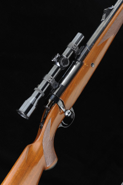 24-inch barrel with ramp fore sight and folding rear sight, the receiver mounted with a Weaver 2.5 telescopic sight, bolt with tang safety, magazine with hinged floor plate, half length stock pistol grip and rubber recoil pad, 12 3/4-inch pull, 10lb. 6oz., nitro proof
