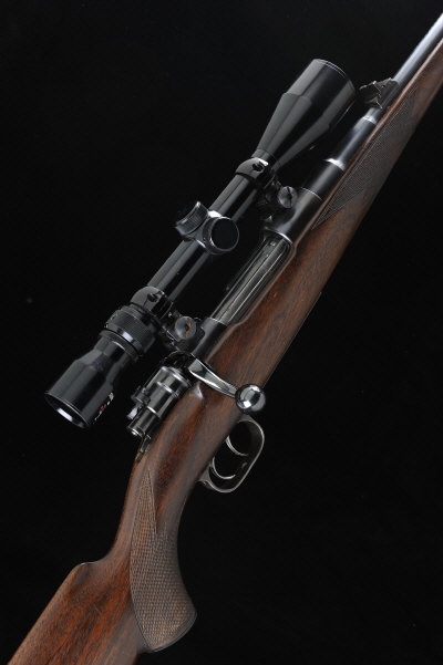 RASTEMEYER A GERMAN 7X57MM BOLT-ACTION SPORTING RIFLE, NO. 1204 24-inch barrel with ramp fore sight and folding leaf sight, the Mauser receiver mounted with a Nikko Stirling telescopic sight, bolt with side safety, double set triggers, the figured half length stock with pistol grip, cheekpiece and ribbed butt plate, 14-inch pull, sling swivels, 7lb. 11oz.. German nitro proof S1 |