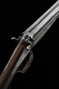 28-inch barrel, the frame, rebounding backlock and rotary under lever with scroll engraving, 13 3/4-inch stock, black powder proof, bore pitted and dented