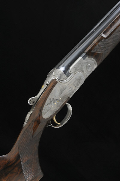 28-inch monobloc barrels with 2 3/4-inch chambers, about 1/2 and 3/4 choke borings, stippled ventilated rib, crossbolt extension, the frame, locks and top lever with fine scroll engraving surrounding detailed scenes of game birds, trigger plate signed "Bottega Giovanelli Inc. E. Lotti", rolled edge trigger guard, selective single trigger, 14 3/4-inch highly figured stock with pistol grip, 7lb. 4oz., Italian nitro proof