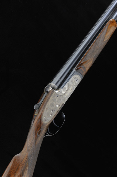 28-inch Whitworth steel barrels with 2 1/2-inch chambers, about 3/8 choke borings, file cut rib, the frame, locks and gold numbered top lever with fine bouquet and scroll engraving and retaining traces of original hardening colour, the maker's name signed in gold, gold lined cocking indicators, 15-inch well figured replacement stock, 6lb. 13oz., nitro re-proof
