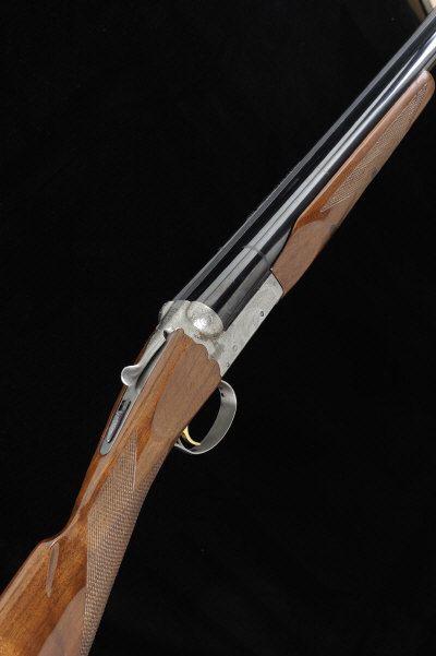 28-inch monobloc barrels with 2 3/4-inch chambers, with interchangeable choke tubes, machined rib, the scroll back frame and top lever with game scene and scroll decoration, selective single trigger, 14-inch figured stock with recoil pad, beaver tail fore-end, 6lb. 5oz., nitro proof, fore-end wood split and repaired, butt piece missing, with three spare chokes