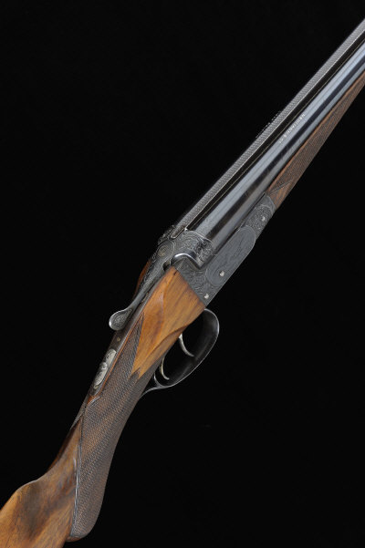NEUMANN & CO. A BELGIAN .410 BOXLOCK NON-EJECTOR GUN, NO. 39296 27 1/2-inch barrels with 2 1/2-inch chambers, about 1/2 choke borings, machined rib with crossbolt extension, the frame and top lever with foliate scroll and game scene engraving, clipped fences, 14-inch figured stock with pistol grip and butt plate, 4lb. 15oz., Belgian nitro proof S2 |