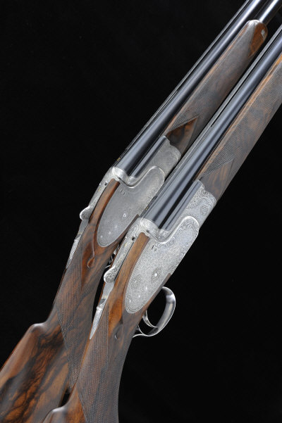 LUCIANO BOSIS A FINE PAIR OF 20-BORE SINGLE TRIGGER SIDELOCK EJECTOR OVER AND UNDER GUNS, NOS. 159/160 28 1/4-inch barrels with 2 3/4-inch chambers with Briley interchangeable choke tubes, file cut narrow ventilated ribs, the frames, locks and gold numbered top levers with fine scroll engraving surrounded by bold foliate and floral borders, the action bases engraved with scenes of pheasant and snipe against realistic backgrounds, the trigger plates signed by the engraver, Naida, the trigger guards with further matching scenes, 14 1/2-inch highly figured stocks with pistol grips and rubber recoil pads, 6lb. 14oz., Italian nitro proof, in their maker's leather case with outer cover, spare chokes, etc |
