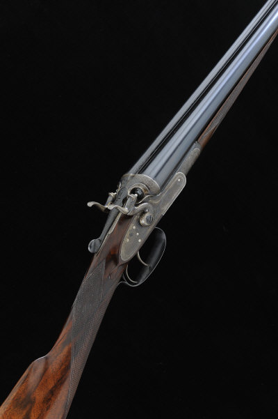 MANTON & CO. A FINE 28-BORE TOP LEVER HAMMER GUN, NO. 5520, REPUTEDLY BUILT FOR THE MAHARAJAH OF JODHPORE 25-inch replacement barrels with 2 1/2-inch chambers, about full and extra full choke borings, the frame, rebounding bar locks, hammers and top lever with fine scroll engraving and retaining much original colour, 14 1/2-inch highly figured stock with engraved heel and toe plates, 4lb. 14oz., nitro proof, in its canvas case, together with a further Brady leather case, etc S2 The vendor states that he has owned the gun for over 30 years and that the gun was reputedly built for the Maharajah of Jodphore, the case lid is painted with his name. The replacement barrels are of best quality and were fitted in 1978 in the London trade. Apparently the original barrels were burst by the use of a ball round and the replacement barrels were fitted when the gun was returned to the UK. |