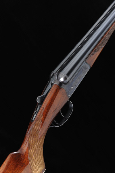 28-inch barrels with 2 3/4-inch chambers, about 1/4 and 3/4 choke borings, the frame and top lever with scroll engraving and retaining much original finish, 15 1/4-inch figured stock with pistol grip and rubber recoil pad, including 1/2-inch extension, 6lb. 15oz., nitro proof