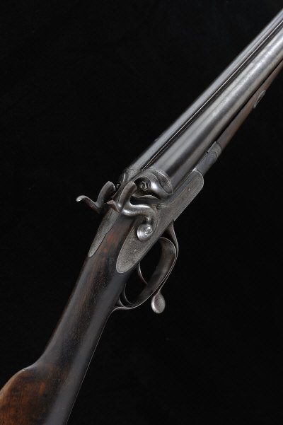 BOSS & CO. A SCARCE 12-BORE HAMMER GUN, NO. 2717 30-inch replacement barrels by Midland Gun Co., with 2 1/2-inch chambers about improved cylinder and full choke borings, the frame, non-rebounding back locks, hammers and rotary underlever with scroll engraving, 14-inch figured stock with steel butt plate, 7lb., nitro proof, bores pitted, right hammer spur broken, worn overall |