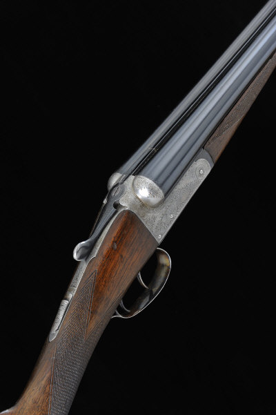 28-inch barrels with 2 1/2-inch chambers, about improved cylinder and 3/4 choke borings, doll's head extension, the frame and top lever with scroll engraving, 14 3/4-inch figured stock with ebonite butt plate, 6lb. 10oz., nitro proof