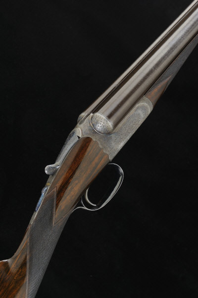 WESTLEY RICHARDS A FINE 12-BORE HAND DETACHABLE DROP LOCK SINGLE TRIGGER BOXLOCK EJECTOR GUN, NO. 16251 30-inch damascus barrels with 2 1/2-inch chambers, about 1/4 and 3/4 choke borings, doll's head extension, the scroll back frame with fine scroll engraving and retaining much original hardening colour, the maker's name signed within a scrolling banner, the removable base plate revealing the hand detachable locks, patent selective single trigger, 13 3/4-inch highly figured stock with engraved heel and toe plates, 6lb. 11oz., nitro re-proof, in its maker's brassbound oak and leather case S2 The maker confirms that the gun was built in 1902 and that it was re-proofed in 1968. |
