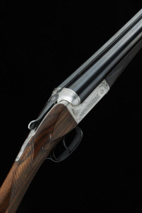 JOSEPH LANG & SON A 12-BORE BOXLOCK EJECTOR GUN, NO. 7995 28-inch sleeved barrels with 2 3/4-inch chambers about 1/4 and 3/4 choke borings, doll's head extension, the frame with border and scroll engraving, 14 1/2-inch figured replacement stock, 6lb. 4oz., nitro proof |