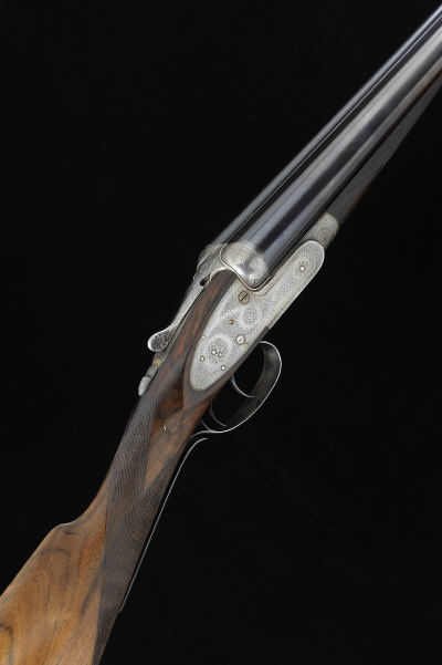 J. PURDEY & SONS A 12-BORE SELF-OPENING SIDELOCK EJECTOR GUN, NO. 14411 30-inch Whitworth steel chopper-lump barrels with 2 1/2-inch chambers, about true cylinder and 1/2 choke borings, the frame, locks and numbered top lever with fine bouquet and scroll engraving, grip safety, 14 1/4-inch well figured stock, 6lb. 13oz., nitro proof, bores lightly marked and dented S2 The maker confirms that the gun was built in 1893 for Frank Bibby as the No.2 gun of a pair, with 30-inch barrels and safety guards. The guns are noted as being "out in black" in 1892. |