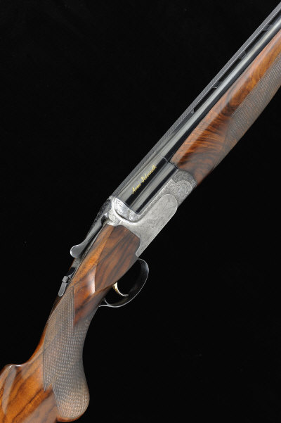 27 1/2-inch monobloc barrels with 3-inch chambers, Teague interchangeable choke tubes, machined ventilated rib, the frame and top lever engraved with scenes of game in flight surrounded by acanthus scroll engraving, selective single trigger, 14 1/2-inch well figured stock with pistol grip and ribbed butt plate, 7lb. 4oz., Italian nitro proof, in its maker's case with spare chokes