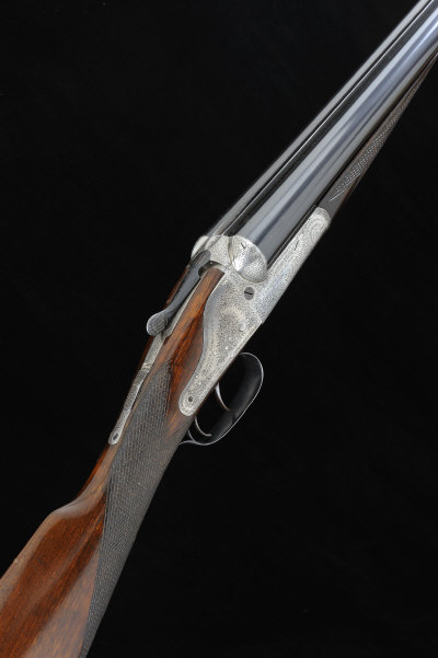 CHARLES LANCASTER A 12-BORE BACKLOCK EJECTOR GUN, NO. 6752 28-inch sleeved barrels with 2 1/2-inch chambers, about 1/4 and 1/2 choke borings, the frame, backlocks and gold numbered top lever with fine scroll engraving, 14-inch figured replacement stock, 6lb. 10oz., nitro re-proof, top rib loose, canvas case with W. J. Jeffery label S2 |