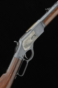 WINCHESTER A .44 WCF MODEL 1873 LEVER ACTION RIFLE, NO. 246766B 24 1/4-inch octagonal to round barrel, buck horn rear sight, full length magazine tube, frame with sliding dust cover and loading gate, 12 3/4-inch stock with crescent butt plate, 8lb. 8oz., nitro proof, refinished overall |