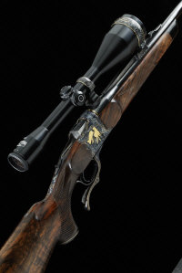 AN AUSTRIAN 7MM REM MAG CUSTOM-BUILT FALLING BLOCK SPORTING RIFLE, NO. 133-59661 25 1/2-inch barrel with ramp fore sight, short raised rib mounted with a Schmidt & Bender 8x56 telescopic sight with claw mounts, gold lined breech, the receiver carved with heavy scroll engraving and gold inlaid hunting scenes, retaining all of its original hardening colour, 14 3/4-inch highly figured stock with pistol grip, cheekpiece and rubber recoil pad, fore-end with ebony tip, sling swivels, 9lb. 10oz., Austrian nitro proof