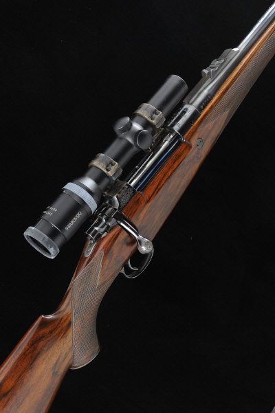 JOHN RIGBY & CO. A FINE .375 H&H MAGNUM BOLT-ACTION SPORTING RIFLE, NO. 6677 22 1/2-inch barrel with ramp fore sight, file-cut short raised rib with gold line folding leaf sights to 200, the receiver mounted with a Swarovski Habivht 1.25-4x24 telescopic sight in H&H type quick detachable mounts, bolt with side safety, recoil stud, magazine with hinged base plate and engraved with scrollwork, the calibre signed in gold, half length well figured stock with pistol grip, cheekpiece and rubber recoil pad, 14 3/4-inch pull, sling eyes, 10lb. 6oz., nitro proof S1 The rifle appears relatively little used. |
