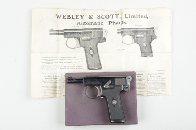 WEBLEY & SCOTT A 7.65MM SELF-LOADING PISTOL, NO. 107407 3 1/2-inch barrel, the frame with side safety, chequered composition grips, retaining much original finish overall, magazine missing, nitro proof, in its maker's original box with instruction leaflet S5 |