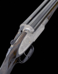 29 1/2-inch barrels with 2 1/2-inch chambers about 1/4 choke borings, the frame, locks and gold-numbered top lever with fine scroll engraving and retaining traces of original hardening colour, the maker's name signed within a scrolling banner, gold-washed lockwork, 14 3/4-inch highly figured stock, 6lb. 8oz., nitro proof, canvas case