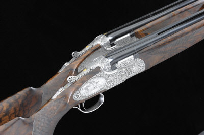 BERETTA A MAGNIFICENT PAIR OF 12-BORE SO6 EELL SINGLE TRIGGER SIDELOCK EJECTOR OVER AND UNDER GUNS, NOS. C16057B AND C16058B 32-inch monobloc barrels with 3-inch chambers about 3/4 choke borings, machined ventilated ribs, the frames, locks and gold numbered top levers with fine acanthus scroll engraving, in relief against a stippled ground, the lock plates each with a realistic game scene showing pheasants, ducks, grouse and geese in flight, the action bases with further scenes of pheasant and woodcock, trigger plates signed by the engraver Inc. Nassa, rolled edge trigger guards, selective single triggers, 15-inch highly figured stocks with pistol grips, 8lb. 7oz., Italian nitro proof, in their maker's lightweight leather case