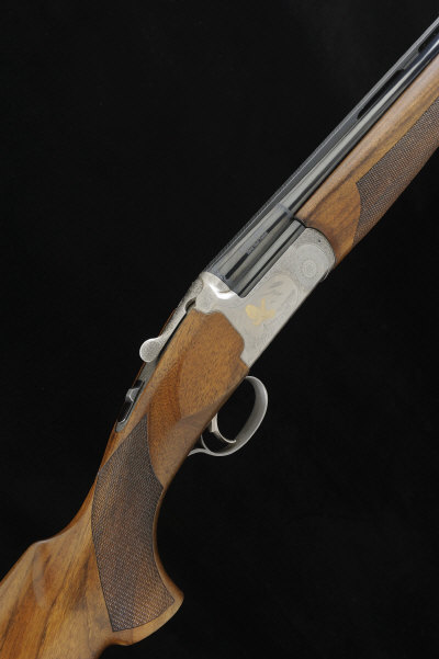 27 1/2-inch monobloc barrels with 3-inch chambers, with interchangeable choke tubes, machined ventilated rib, the frame and top lever with scroll decoration, surrounding scenes of gold highlighted game birds, selective single trigger, rolled edge trigger guard, 14 1/4-inch figured stock with pistol grip and slim recoil pad, 6lb. 11oz., Italian nitro proof for steel shot, in its maker's plastic case with spare chokes, recoil pad, etc