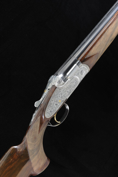 P. BERETTA A 12-BORE S3 EELL MODEL SINGLE TRIGGER OVER AND UNDER GUN, NO. 18311 26 3/4-inch monobloc barrels with 2 3/4-inch chambers, about 1/4 and 3/4 choke borings, file-cut ventilated rib, the frame, locks and top lever engraved with flowering roses set against a lined ground within scrolling borders, gold lined cocking indicators, the trigger plate signed by the engraver, "Slatnik", 14 3/4-inch figured stock with pistol grip and rubber recoil pad, 6lb. 12oz., Italian nitro proof, barrel wall thickness below the recommended minimum, leather case S2 |