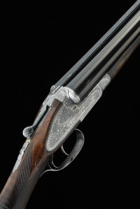 30-inch barrels with 2 1/2-inch chambers about 1/4 and 1/2 choke borings, rising Rigby Bissell third bite, the frame, locks and gold numbered top lever with scroll engraving and retaining traces of original hardening colour, fences carved with fern leaves, 14 1/2-inch figured stock including recoil pad, 6lb. 13oz., nitro re-proof, leather case, barrel wall thickness marginal