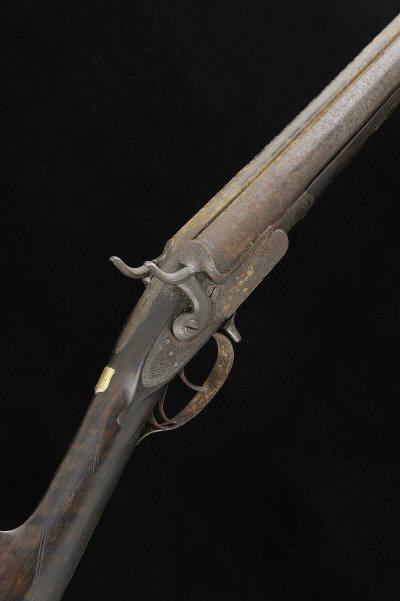 W. R. PAPE A 16-BORE PATENT HAMMER GUN, NO. 1790 30-inch damascus barrels with 2 1/2-inch chambers, about true cylinder borings, the frame, push-forward side lever, non-rebounding locks and hammers with scroll engraving, self retracting strikers, 14 1/4-inch figured stock with steel butt plate, 6lb. 12oz., black powder proof, bores pitted, worn overall S2 The gun incorporates patent number 1501 of 1806. |