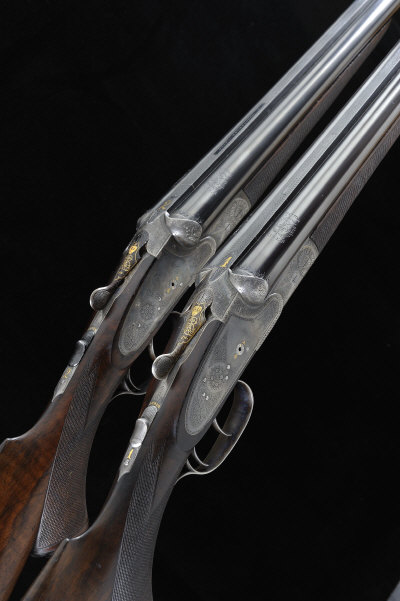29 1/2-inch Krupp steel barrels with 2 1/2-inch chambers, about 1/2 and full choke borings, machined ribs and Kersten bolt extensions, the frames, locks and gold inlaid top levers with fine bouquet and scroll engraving and retaining much hardening colour overall, the maker's name signed within a scrolling banner, the fences with fluted side clips, gold lined cocking indicators, 14 1/2-inch highly figured stock including pistol grips, cheekpieces and ribbed butt plates, sling swivels, 6lb. 9oz., nitro re-proof
