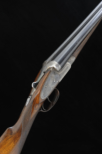 ARMY & NAVY C.S.L. A 12-BORE SIDELOCK EJECTOR GUN, NO. 57647 28-inch barrels with 2 1/2-inch chambers, about true cylinder and improved cylinder borings, possibly shortened, the frame, back action bar locks and top lever with scroll engraving and retaining much original hardening colour, 14 1/4-inch figured stock with ribbed butt plate, slightly cast-on for the left shoulder, 6lb. 9oz., nitro proof, in its maker's canvas case S2 |