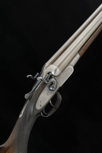 MIDLAND GUN CO. A 20-BORE TOP LEVER HAMMER GUN, NO. 70852 28-inch damascus barrels with 2 1/2-inch chambers, about 1/2 and 3/4 choke borings, doll's head extension, the frame, rebounding back locks, hammers and top lever with border engraving and retaining traces of original hardening colour, 15 1/4-inch figured stock with semi pistol grip including 1 1/4-inch extension, 6lb. 1oz., nitro re-proof S2 |