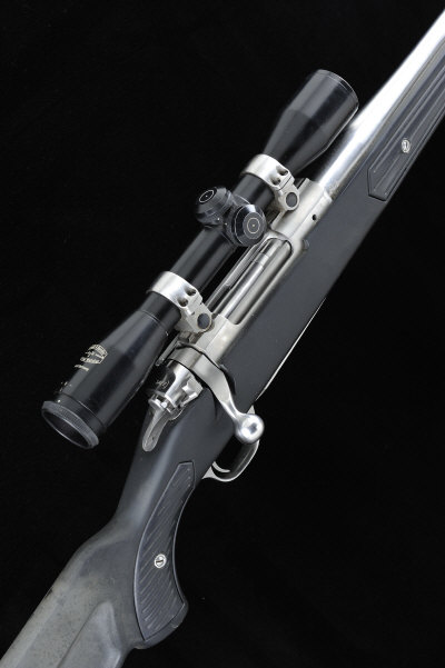 RUGER A .243 MODEL M77 MARK II BOLT-ACTION SPORTING RIFLE, NO. 781-65916 22-inch stainless steel barrel, the receiver mounted with a Schmidt & Bender 4x36 telescopic sight, bolt with side safety, magazine with hinged base plate, half length plastic stock with pistol grip, 13 1/2-inch pull, 8lb. 2oz., nitro proof, home-made case with instruction booklet S1 |