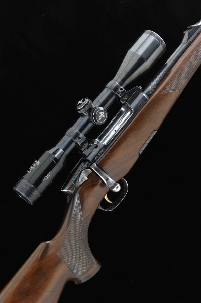 MANNLICHER A 243 "LUXUS" MODEL BOLT-ACTION STUTSEN RIFLE, NO. 116517 20-inch barrel with ramp fore sight, rear sight removed, the receiver mounted with a Swarovski Habicht 6x42 telescopic sight on swing-off Apel mounts, bolt with side safety, detachable box magazine, the full length figured stock with pistol grip, cheekpiece and recoil pad, sling swivels, 9lb., Austrian nitro proof S1 |