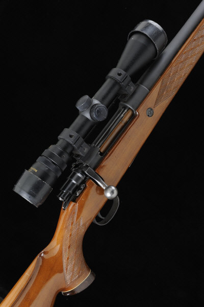 24-inch heavy barrel, the receiver mounted with a Nikko Stirling telescopic sight, bolt with side safety, recoil stud, detachable box magazine, the half length stock with pistol grip, cheekpiece and rubber recoil pad, 10lb. 13oz., nitro proof