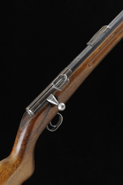 MAUSER A .22 45 PRE-WAR SINGLE SHOT BOLT-ACTION SPORTING RIFLE, NO. 73975 25 1/2-inch barrel fitted with a sound moderator, open sights removed, the receiver with side safety and dove-tail grooves, half length stock with pistol grip and steel butt plate, cracked behind the bolt handle, 14-inch pull, 6lb. 8oz., nitro proof S1 |