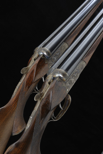 28 1/4-inch barrels with 2 1/2-inch chambers, about 1/4 and 3/4 and 1/2 and 3/4 choke borings respectively, machined solid ribs with crossbolt extensions, the scroll back frames and top levers engraved with scenes of dogs and game surrounded by scroll engraving and retaining virtually all of their original hardening colour, the trigger guards engraved with the initials "CBV", 14 1/2-inch figured stocks with pistol grips and engraved heel and toe plates, 6lb. 8oz., nitro proof, in their individual Brady canvas cases