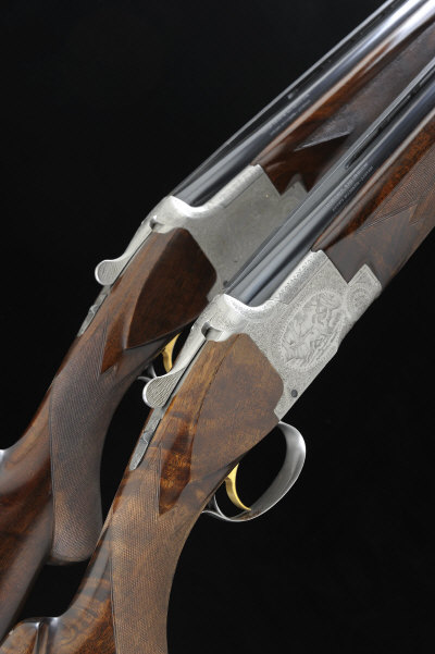BROWNING A MATCHED PAIR OF BELGIAN 12-BORE SINGLE TRIGGER OVER AND UNDER EJECTOR GUNS, NOS. 51629S6 AND 51657S6 26 1/2-inch barrels with 2 3/4-inch chambers, about 1/4 and 1/2 choke borings, machined ventilated ribs, engraved "Made for Abercrombie & Fitch", the frames and top levers with fine scroll engraving surrounding scenes of dogs and game in landscapes, signed by the engravers "C. Lambert" and "R. Greco", selective single triggers, 14-inch highly figured stocks with semi pistol grips and leather covered recoil pads, 7lb. 10oz., Belgian nitro proof, lightweight plastic case S2 |