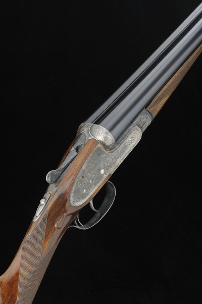 27 5/8-inch chopper-lump barrels with 2 3/4-inch chambers, about improved cylinder and 3/8 choke borings, the frame and hand detachable locks with fine bouquet and scroll engraving and retaining much original hardening colour, gold lined cocking indicators, rolled edge trigger guard, 14 1/2-inch well figured stock, 6lb. 10oz., nitro re-proof