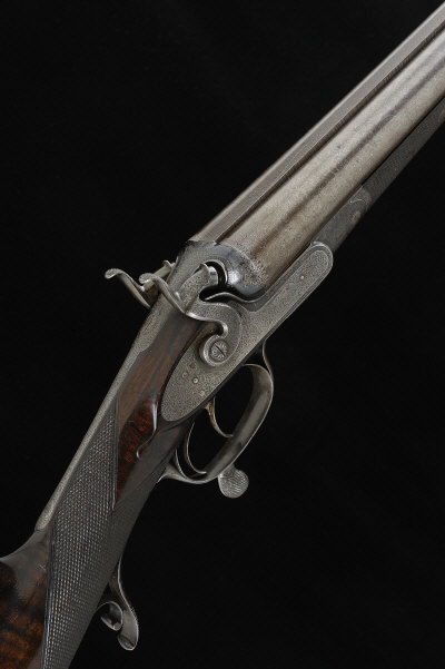 30-inch damascus barrels with 2 5/8-inch chambers, about true cylinder borings, wide machined flat top rib, the frame, non rebounding bar locks, hammers and rotary underlever with fine scroll engraving and retaining some original hardening colour, 14 1/2-inch highly figured stock with cheekpiece and engraved skeleton heel plate, sling swivels, 8lb. 14oz., black powder proof